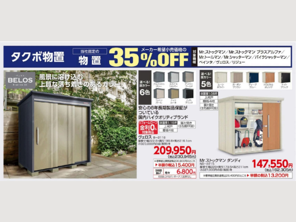 通常定価の30%OFFでご案内しているタクボ物置がなんとフェア期間中限定で定価の35%OFFでのご案内となります!